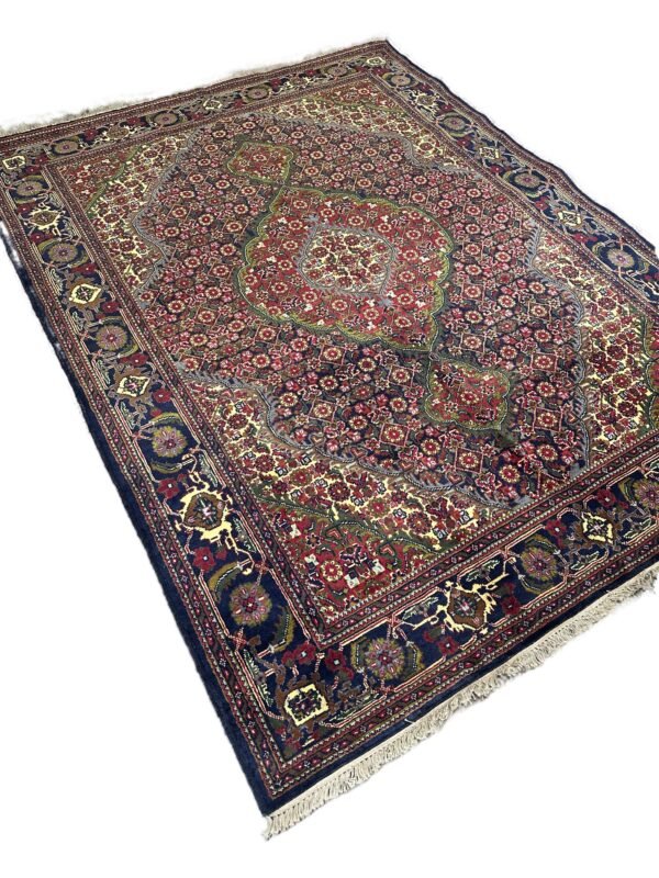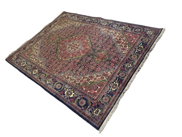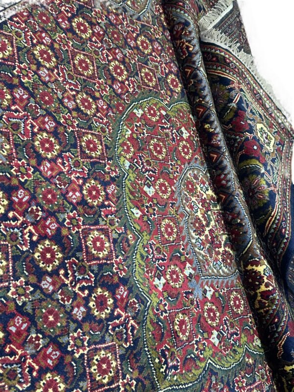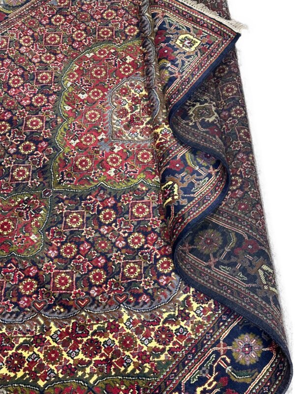 Experience the rich heritage of Afghan weaving with this stunning ‘Nomad Collection’ rug. Each knot is tied by hand, creating a dense and luxurious pile from pure, resilient Afghan wool. It showcases a classic design with deep, warm reds and contrasting dark blue and ivory details, perfect for creating an inviting atmosphere with authentic Afghan charm.