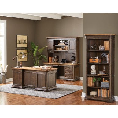 Open Bookcase with 3 adjustable shelves provides the elements to create a truly inspirational office environment. Hand planked wood veneers in a rich, dark roast finish the color of freshly brewed coffee, show highlights of natural wood that has aged and is mildly distressed. Distressing includes rasping, chopping and worm holes, along with varied species, solid wood plank tops that accent the dark finish and emphasize the wood’s natural beauty for two-tone authenticity.