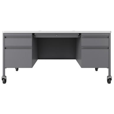 Double pedestal teachers desk that provides a practical desk solution to any educational environment. The T-mold edge promotes safety while the laminate provides a durable scratch and stain resistant surface that is easy to clean and disinfect. Four casters add mobility and allow for easy classroom reconfiguration.